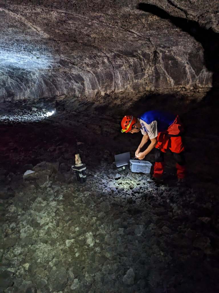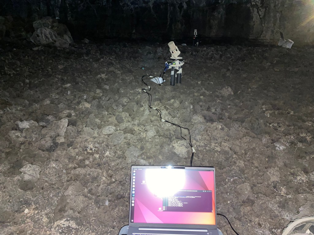 Our first stop was the Los Naturalistas cave. A young lava cave, about 300 years old, with walls and ceilings with little roughness. We conducted two sets of measurements in two different corridors, one with a bend and the other with a small slope.